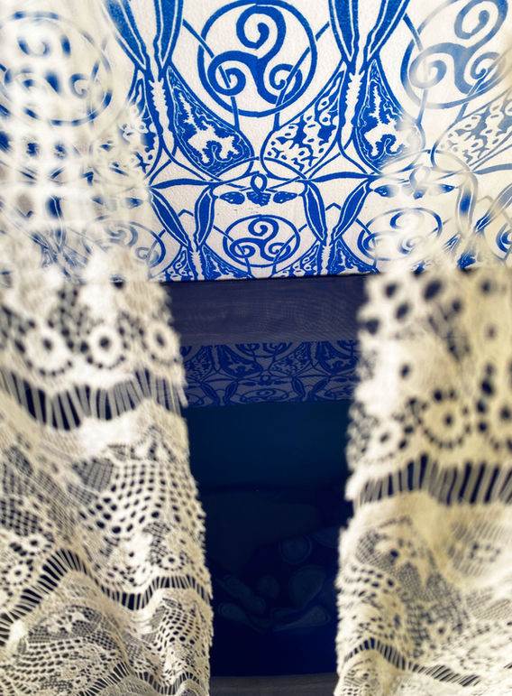 The block prints on the backsplash are inspired by the uterus and the histology of the uterine lining. The Celtic knot in the pattern represents growth amid the cycle of life, death, and rebirth. The prints at the bottom of the piece are blastocysts, or developing cells, after the first six days of fertilization.